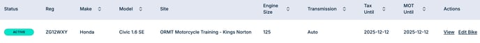 Bike table shows key details like registration, make/model, site location, engine size, transmission type, tax and MOT expiry dates — with quick access to view or edit each bike.