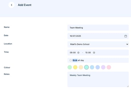 Events are internal calendar functions that don't appear on RideTo.com or your booking widget. They're excellent for managing day-to-day business operations.
